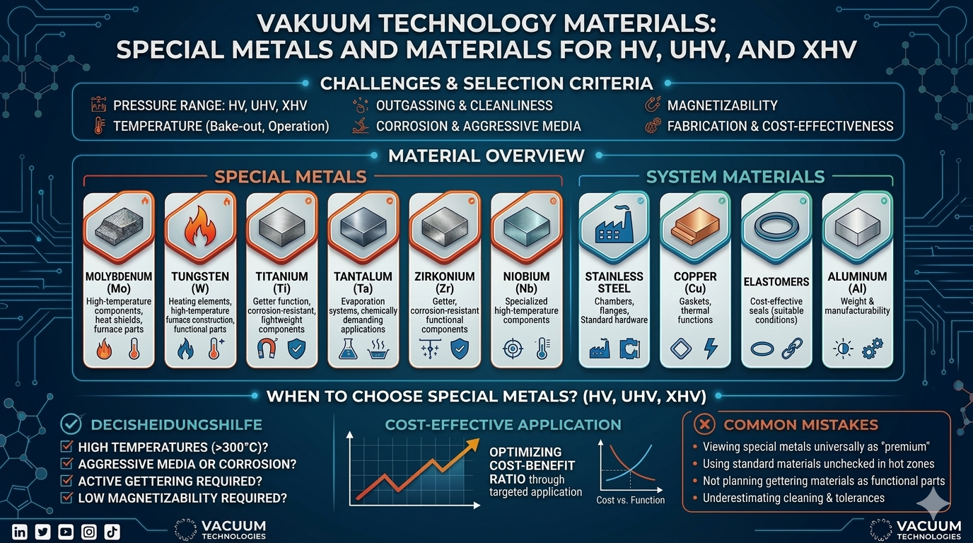 These materials are not important in vacuum technology because they are rare or especially demanding. They are used because they solve specific technical challenges: high thermal stability, strong high-temperature performance, low thermal expansion, corrosion resistance, defined physical properties, or getter behavior.